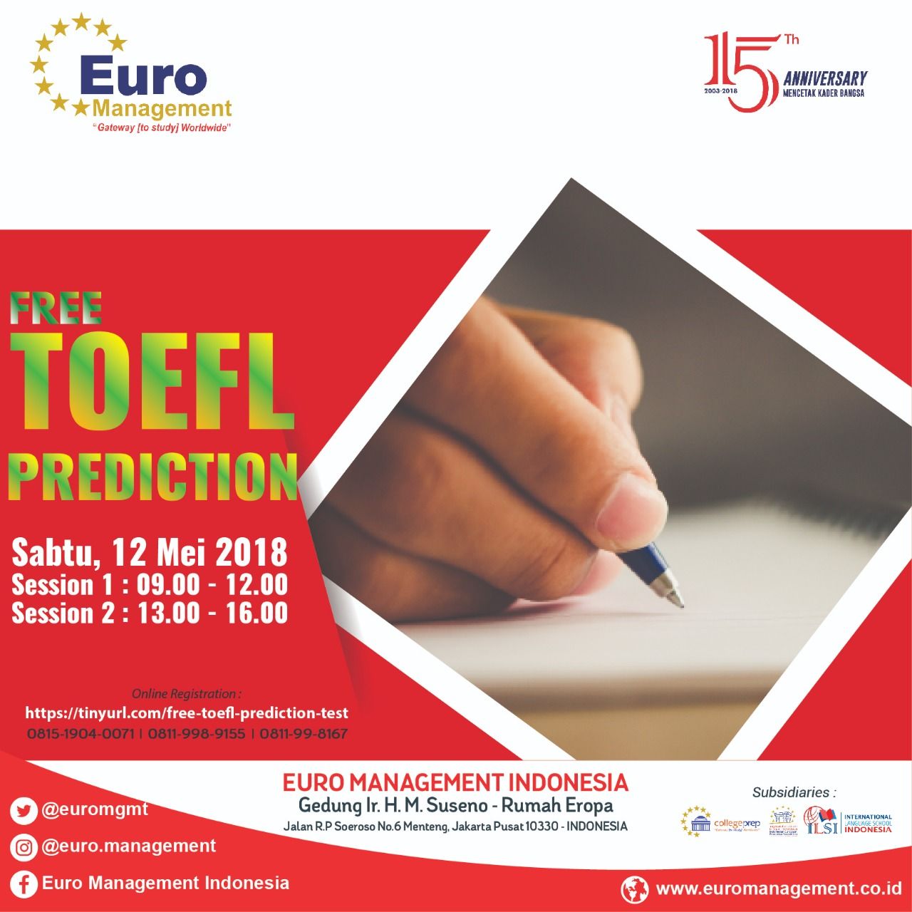 Acara ini GRATIS, tidak dipungut biaya untuk pendaftaran melalui link yang kami berikan. Pendaftaran on the spot pada saat acara dikenakan biaya Rp 250.000,- Tempat terbatas, kami memprioritaskan 50 pendaftar pertama, atau pendaftaran akan kami tutup jika quota sudah terpenuhi. Untuk informasi lebih lanjut silakan menghubungi nomor ini: 0815 1904 0071 / 0811 998 9155 / 0811 99 8167