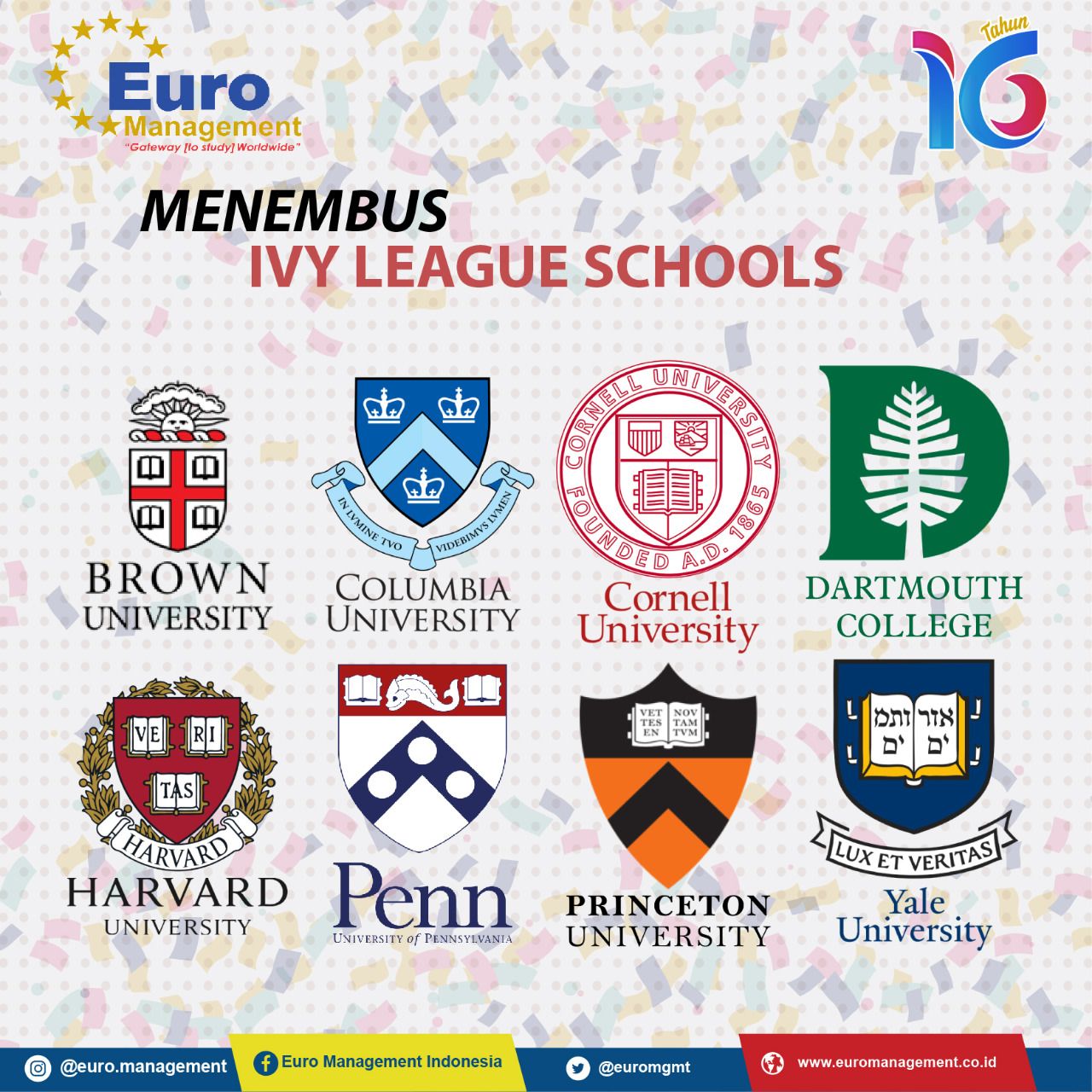Rencanakan studi kalian bersama Euro Management Indonesia Konsultan Pendidikan Internasional berpengalaman selama 16 tahun mencetak kader bangsa lebih dari 3000 anak bangsa di jantung dunia.