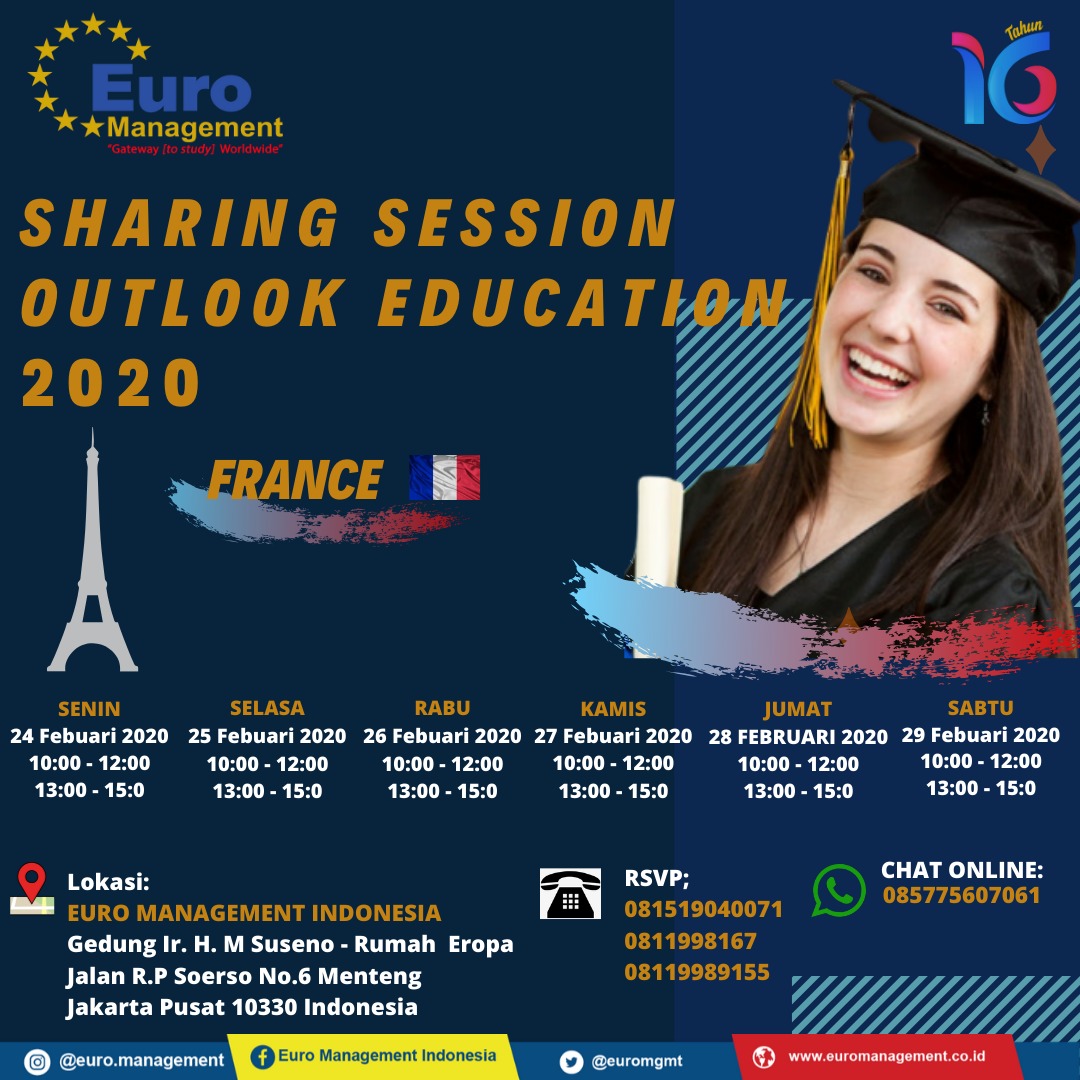Education Outlook France 2020 merupakan kegiatan Sharing Session yang bertujuan untuk mensosialisasikan progam – progam Studi ke Negara Prancis. Persiapaan WorkShop pengenalan budaya dan Sistem pendidikan di Prancis untuk Program S1, S2, & S3.