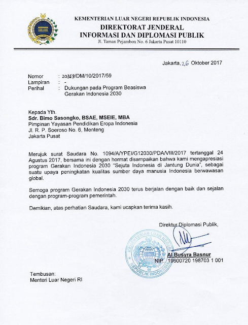 Surat dukungan yang di berikan kepada Euro Management Indonesia sebagai satu-satunya konsultan pendidikan Internasional terbesar di Indonesia yang mempunyai Ikatan Alumni yang Kuat, untuk terus mensosialisasikan program unggulannya, yaitu Program Beasiswa Bahasa yang bertemakan Indonesia 2030: Sejuta Indonesia di Jantung Dunia. Salah satu cara yang dilakukan oleh Euro Management Indonesia adalah dengan terus melakukan pertemuan dan kerjasama dengan berbagai institusi pemerintahan.