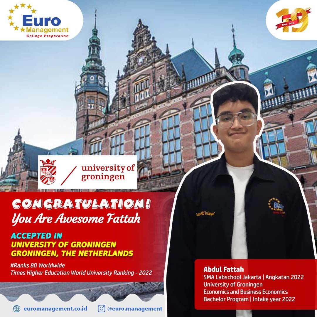 Abdul Fattah SMA Labschool Jakarta | Angkatan 2022 ACCEPTED IN 👍 ​University Of Gronigen, Groningen, The Netherlands Economics and Business Economics Bachelor Program | Intake year 2022