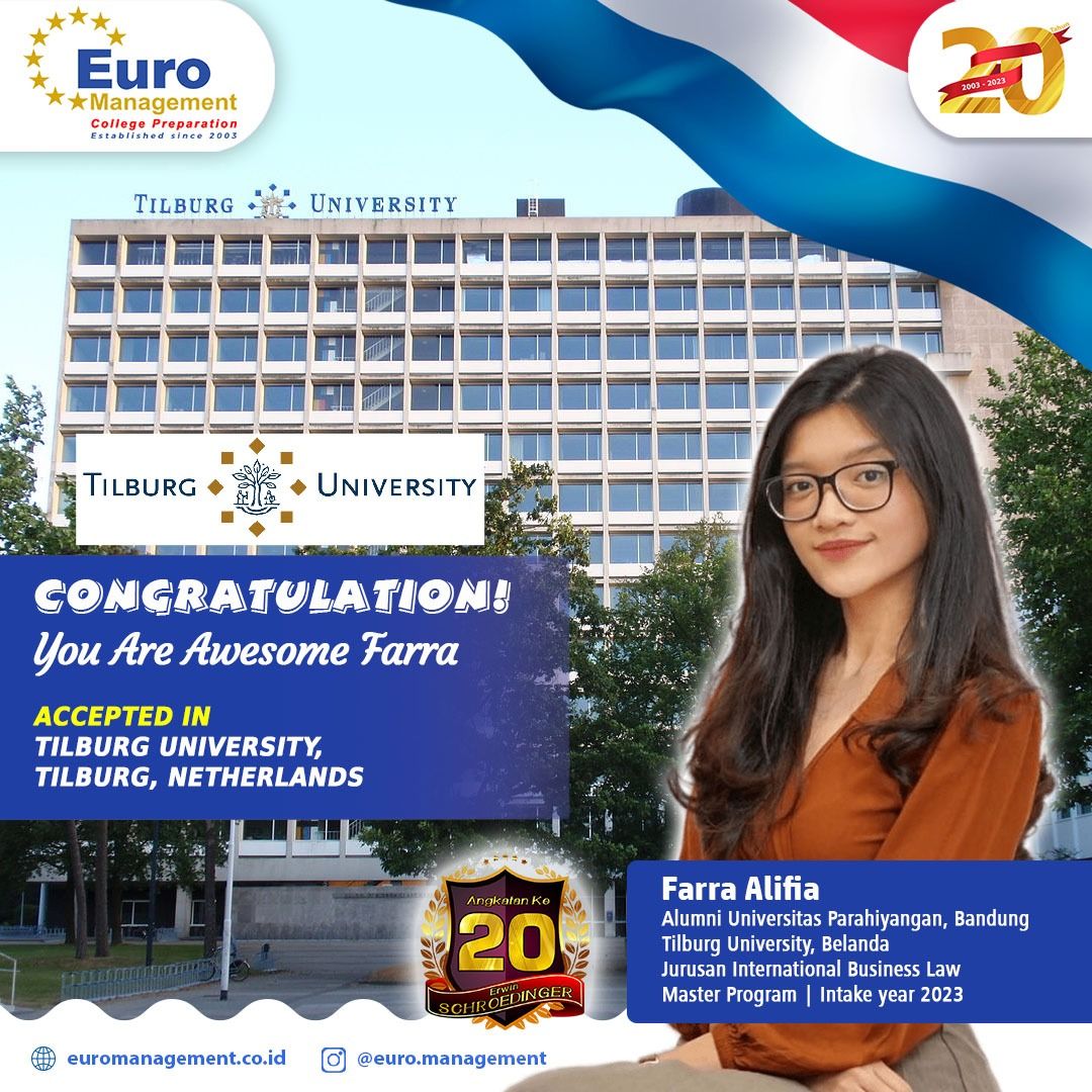 CONGRATULATION! You Are Awesome Kak Farra Alifia CONGRATULATION!You Are Awesome Kak Farra AlifiaFarra AlifiaUniversitas Parahiyangan BandungACCEPTED INTilburg University, BelandaJurusan Internasional Business TaxationMaster Program | Intake year 2023🏛 RUMAH EROPAJl. Teuku Cik Ditiro No. 61Menteng, Jakpushttps://g.co/kgs/zytCmw📢 081199816702139838706#kuliahdibelanda #s2dibelanda #masterdibelanda