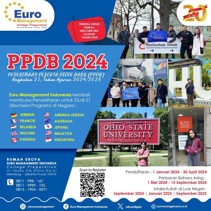 EURO MANAGEMENT INDONESIA College Preparation, Established since 2003, kembali membuka Pendaftaran PENERIMAAN PESERTA DIDIK BARU (PPDB) Angkatan 21, Tahun ajaran 2024/2025