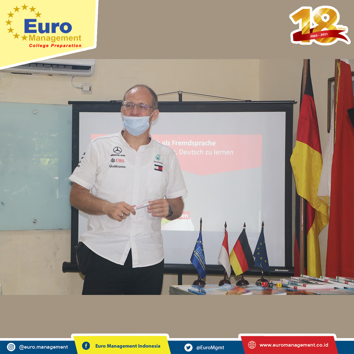 Selasa, 15 Juni 2021. Euro Management Indonesia melakukan Internal Training untuk memperbarui bahan ajar khususnya Bahasa Jerman. Bahan ajar tersebut tidak tanggung-tanggung didatangkan langsung dari Jerman. Dr. Raimond Selke selaku konsultan pendidikan internasional membawa bahan ajar tersebut untuk memberikan pengetahuan dan penjelasan kepada pengajar terhadap buku tersebut. Perbaruan bahan ajar tersebut dimaksudkan agar materi pelajaran yang ada di Euro Management selalu terbarui dan terjamin kualitas bahasanya.