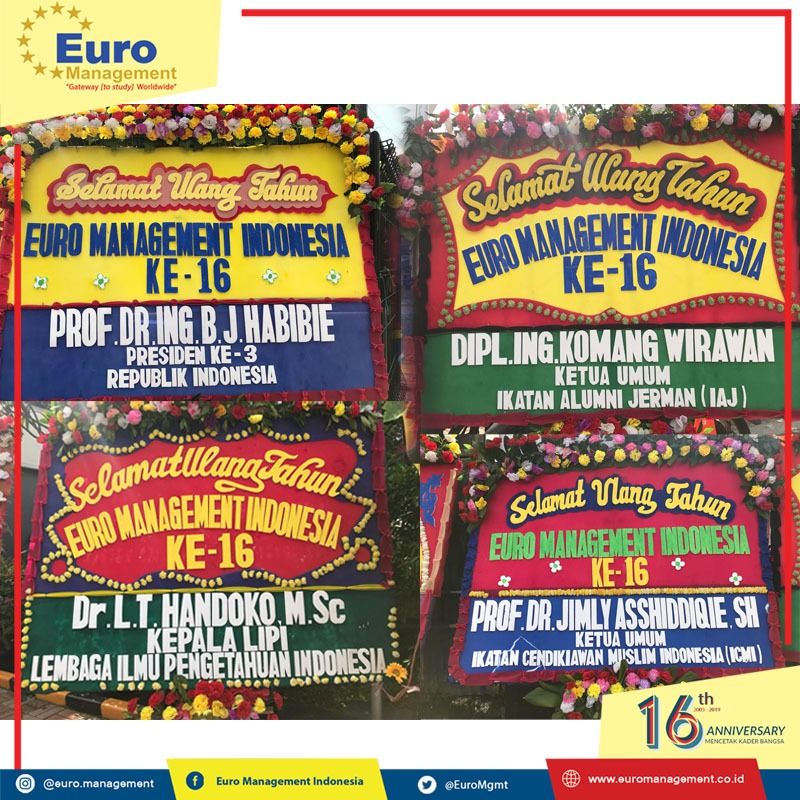 Suatu Kehormatan luar biasa & menjadi suatu kebanggaan tersendiri, perayaan Hari Jadi Euro Management Indonesia Ke 16 (13 April 2003 - 13 April 2019), karangan bunga berisi ucapan selamat berdatangan daripara tokoh nasional & Kolega, antara lain :
