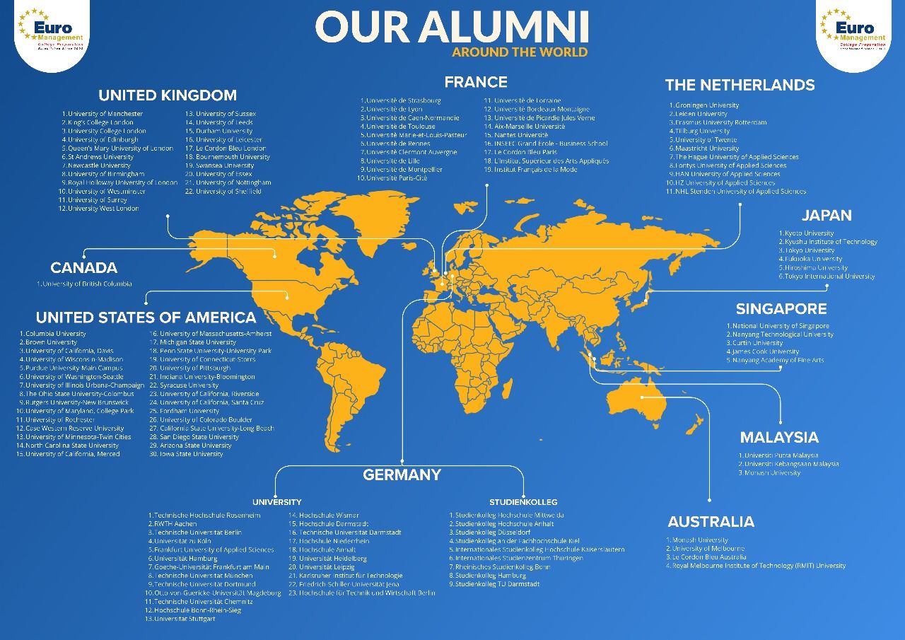 Euro Management Indonesia bangga telah mendampingi banyak siswa hingga berhasil masuk ke universitas terbaik di berbagai negara! Berikut beberapa alumni kami tahun ini: