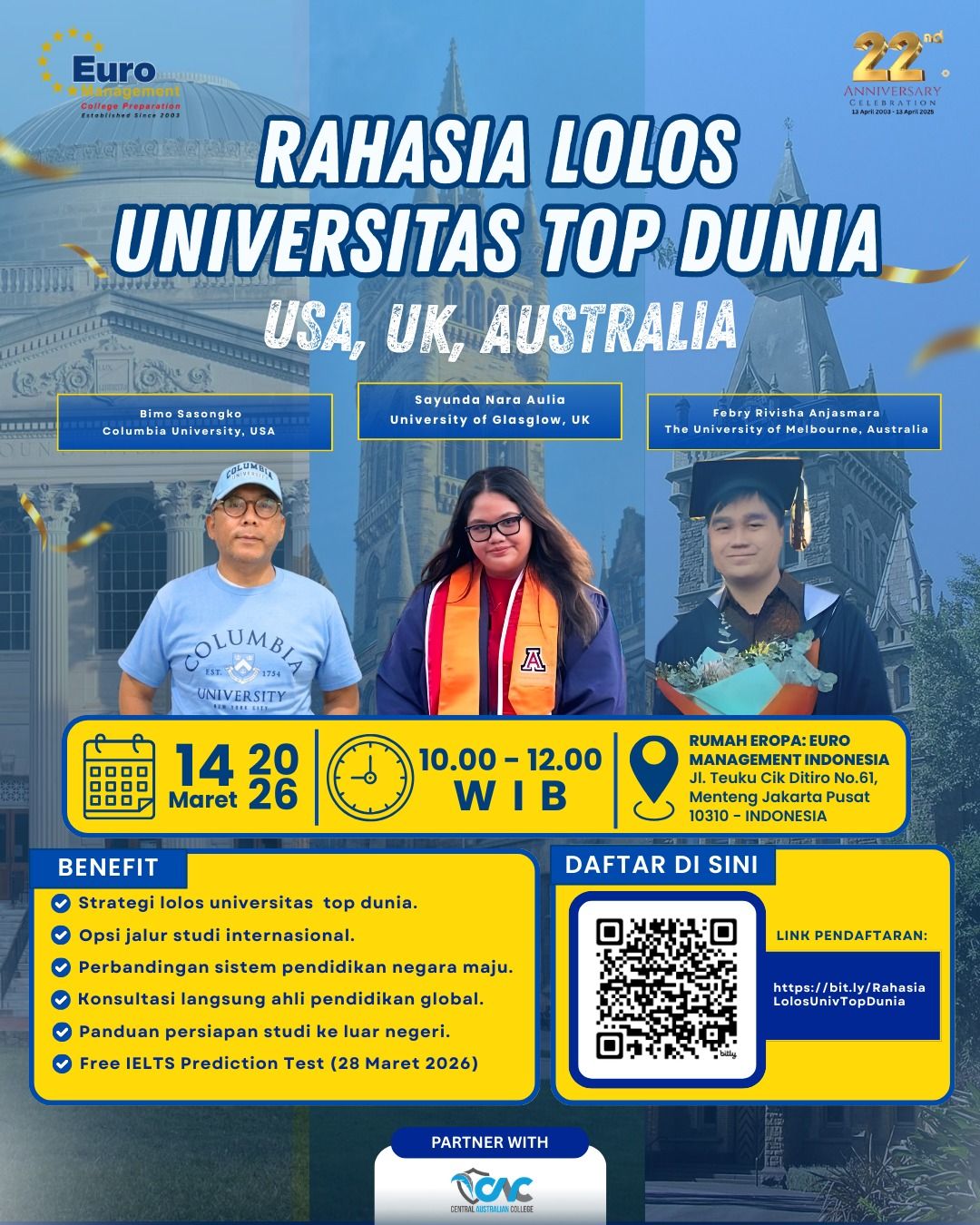 Yuk, ikuti Workshop Rahasia Lolos Universitas Top Dunia bersama narasumber berpengalaman dari Euro Management Indonesia. Dalam workshop ini kamu akan mendapatkan wawasan dan strategi penting untuk mempersiapkan diri menembus kampus internasional di Amerika Serikat, Inggris, dan Australia.