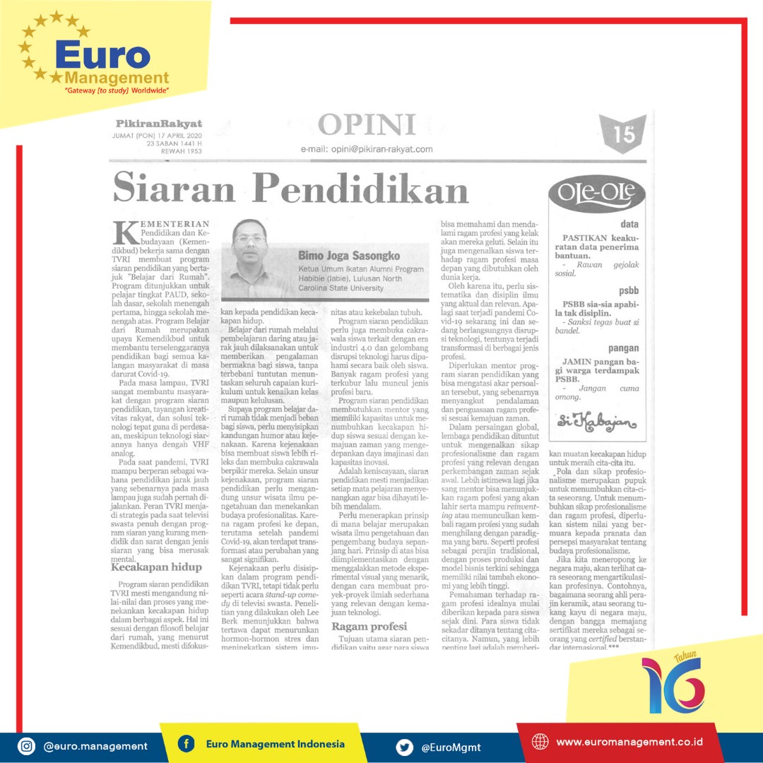 SIARAN PENDIDIKAN PIKIRAN RAKYAT Jumat, 17 April 2020 BIMO SASONGKO, BSAE,MSEIE,MBA, Faunder Euro Management Indonesia I Ketua Umum Ikatan Alumni Program Habibie-IABIE I Sekjen IAJ - Ikatan Alumni Jerman