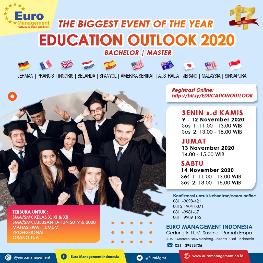 Education Outlook 2020 merupakan kegiatan Sharing Session yang bertujuan untuk mensosialisasikan Program - Program Studi ke Negara - Negara Jerman, Prancis, Inggris, Belanda, Spanyol, Amerika Serikat, Australia, Jepang , Malaysia & Singapura. Pengenalan Budaya dan Sistem pendidikan di Luar Negeri untuk Program S1 (Bachelor) & S2 (Master).