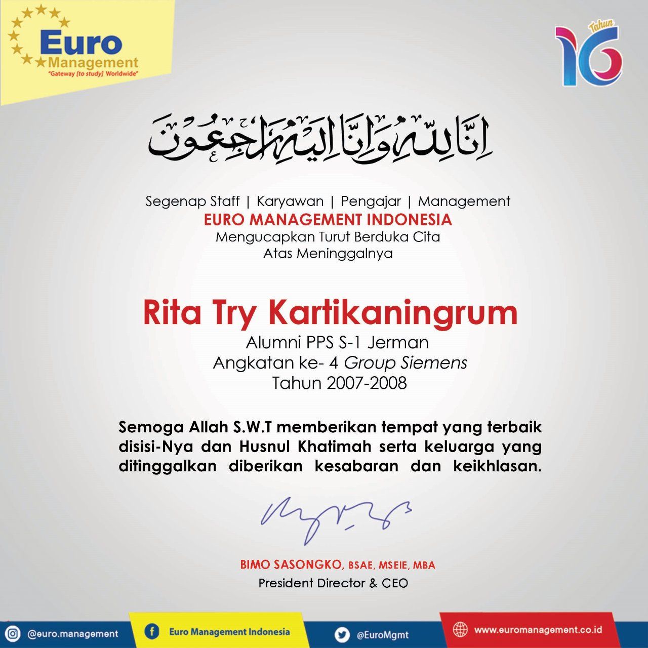 Turut Berduka Cita Atas wafatnya Rita Try Kartikaningrum Alumni Euro Management Indonesia