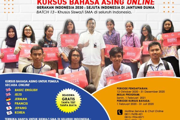 BEASISWA KURSUS BAHASA ASING ONLINE GERAKAN INDONESIA 2030 : SEJUTA INDONESIA DI JANTUNG DUNIA SEJUTA HABIBIE UNTUK INDONESIA Gelombang ke - 13, Tahun 2020