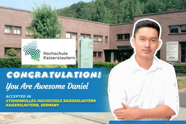 CONGRATULATION You are Awesome Daniel Partogi Christopher Tambunan SMAN 2 Jakarta Angkatan 2021 ACCEPTED IN Studienkolleg Hochschule Kaiserslautern Kaiserslautern, Germany Jurusan Teknik Bachelor Program Intake year 2022