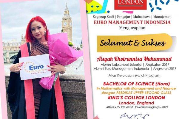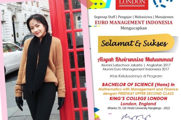 Aisyah Khoirunnisa Muhammad Alumni Labschool Jakarta Angkatan 2017 I Alumni Euro Management Indonesia 2017 Atas Kelulusannya di Program BACHELOR OF SCIENCE (Hons) In Mathematics with Management and Finance dengan predikat UPPER SECOND CLASS KING'S COLL