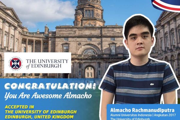 CONGRATULATION! You Are Awesome Almacho Rachmanudiputra Alumni Universitas Indonesia Angkatan 2017 ACCEPTED IN The University of Edinburgh Entrepreneurship and Innovation Edinburgh, United Kingdom Master Program | Intake year 2022
