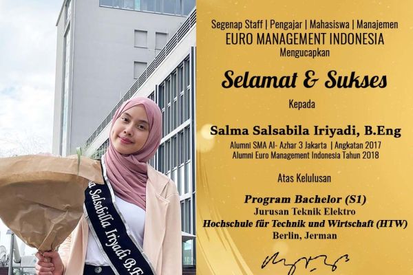 Selamat & Sukses Salma Salsabila Iriyadi, B.Eng Alumni SMA Al- Azhar 3 Jakarta Angkatan 2017 | Alumni Euro Management Indonesia Tahun 2018 Atas Kelulusan Program Bachelor (S1) Jurusan Teknik Elektro Hochschule für Technik und Wirtschaft (HTW) Berlin