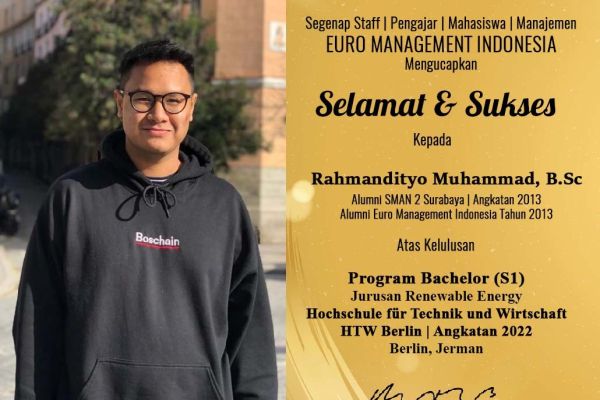 Selamat & Sukses Kepada Rahmandityo Muhammad, B.Sc Alumni SMAN 2 Surabaya | Angkatan 2013 Alumni Euro Management Indonesia Tahun 2013 Atas Kelulusan Program Bachelor (S1) Jurusan Renewable Energy Hochschule für Technik und Wirtschaft HTW Berlin | Angkat