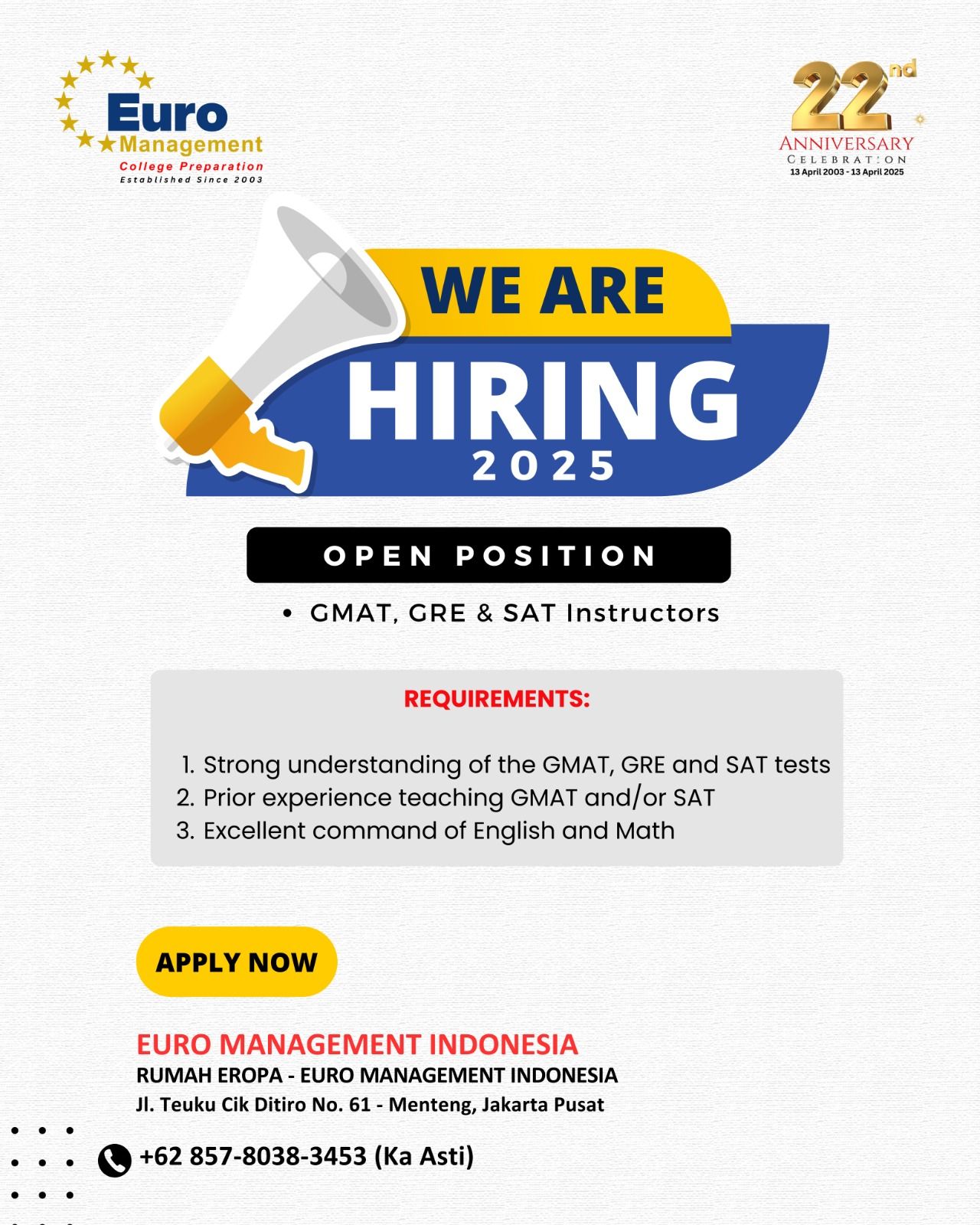 π Menteng, Jakarta PusatEuro Management Indonesia, lembaga konsultan pendidikan internasional terkemuka yang membantu pelajar Indonesia selama 22 tahun meraih mimpi studi ke luar negeri (S1, S2, S3) di negara-negara maju seperti Jerman, Prancis, Belanda, Amerika Serikat, Inggris, Australia, Jepang, Malaysia, dan Singapura, sedang mencari Instruktur GMAT, GRE & SAT!π― Kualifikasi: