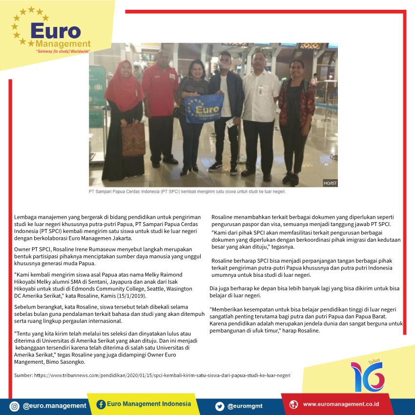 Euro Management Indonesia bekerjasama dengan PT Sampari Papua Cerdas Indonesia (PT SPCI) kembali memberangkatkan kembali Mahasiswa atas nama Melki Raimon H Asal Sekolah SMKN 8 Jayapura , yang akan melanjutkan studi nya Edmonds Community College, Amerika Serikat