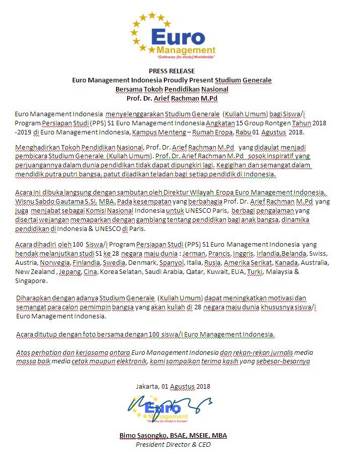 Diharapkan dengan adanya Studium Generale (Kuliah Umum) dapat meningkatkan motivasi dan semangat para calon pemimpin bangsa yang akan kuliah di 29 negara maju dunia khususnya siswa/i Euro Management Indonesia.