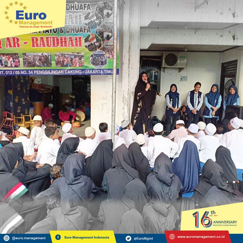 Euro Management Indonesia terus menjalankan programnya di hari ke 15 Ramadhan, Euro mengadakan Buka Puasa bersama di Rumah Singgah Ar Raudhah yang menaungi anak Yatim, Dhuafa & para Janda. Kegiatan ini berlangsung:
